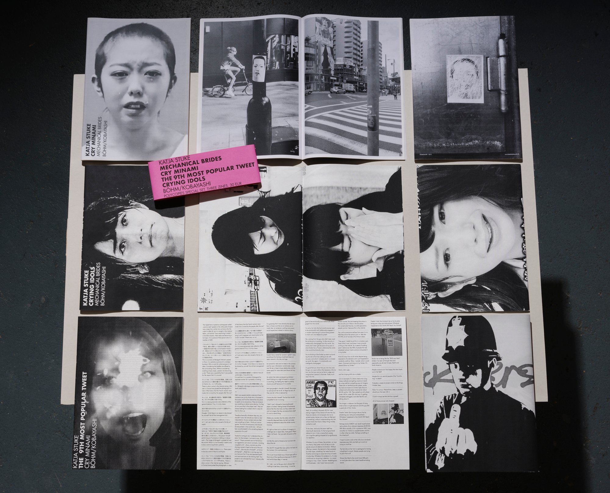 Set of 3 Zines Katja Stuke, Cry Minami, Crying Idols, The 9th. most popular Tweet 3 Photo-Zines, 2016/2018 Digital offset and Xerox-print 29,7 × 21 cm Each about 62 pages.